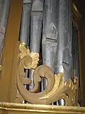II/p | 13 | Création mit Haupt- und Brustwerk; Le postif de dos in der Brüstung est à trappe; Gehäuse mit originalen Prospektpfeifen erhalten, deren Eselsrücken-Labien auf ein älteres Datum hinweisen (probablement gothique tardif). ![]() |