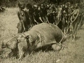 En Afrique, les hippopotames sont connus sous diverses appellations, dont seekoei (Afrikaans), mvuvu (Venda), kubu (Lozi) et mvubu (Xhosa, Swati et Zoulou) dans le sud[48] ; kiboko (Swahili), ensherre (Nkore), tomondo (Nyaturu), nvubu (Luganda), ifuru (Luyia), emiria (Ateso), magawit (Sebei), kibei (Kalenjin) et olmakau (Maasai) dans la région des Grands Lacs[7] ; :256 et ጉማርረ/gumarre (Amharique)[49] et jeer (Somali) dans la corne de l’Afrique[50].