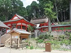 Dédié aux divinités bouddhistes et shintoïstes, il possède un massha (sous-sanctuaire), des tahōtō (pagodes), un kagura-den (bâtiment sacré de danses), un shōrō (beffroi) et un kannon-dō (déesse de la Miséricorde) ainsi que d'autres bâtiments. Toutefois ces édifices sont détruits lors de la mise en œuvre de la politique de séparation du shintoïsme et du bouddhisme au cours de l'ère Meiji.