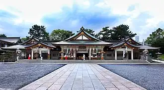 - ↑ L'un de ses trois toriis est resté debout et les bâtiments ont été détruits. Voir destructions à Hiroshima.