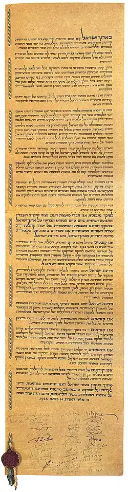 Dans la déclaration d'indépendance, Ben Gourion met en relief le caractère juif de l'État d'Israël tout en y proclamant le respect de la liberté de conscience et de culte. Il lutte pour que Jérusalem reste à l'intérieur de l'État juif et la proclame capitale d'Israël[8],[Note 2].
