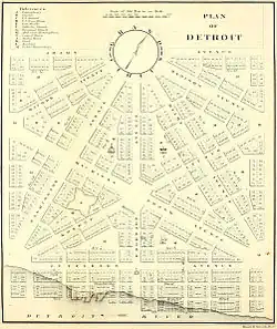 En 1805, Détroit a subi un incendie dévastateur, qui a détruit la majeure partie de l'architecture coloniale française de la ville. Peu après, le père Gabriel Richard a dit, meliora de Speramus ; cineribus de resurget (« nous espérons de meilleures choses ; elle ressuscitera de ses cendres ») qui sont devenues la devise officielle de la ville. Le juge Augustus B. Woodward a conçu un plan semblable à la conception de Pierre Charles L'Enfant de la ville de Washington.