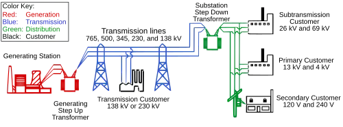 Les équations d'Ohm () impliquent que la puissance électrique transportée par un réseau est d'autant plus élevée que la tension appliquée à ce réseau est élevée, et que la résistance du réseau est faible. L'effet Joule implique, quant à lui, que la perte de puissance lors du transport croît avec la résistance du réseau et le carré de l'intensité du courant (). Ces deux lois physiques amènent, pour optimiser le transport d'électricité, à avoir une résistance du réseau la plus faible possible, et une tension appliquée à ce réseau la plus élevée possible[34].