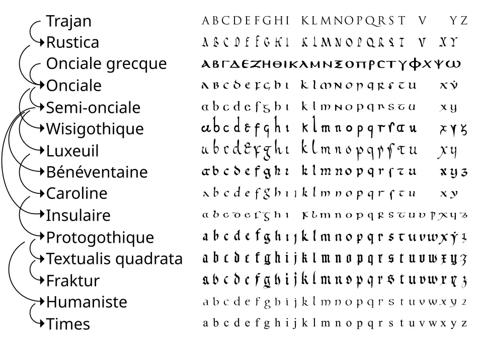 Les changements de support ont parfois entraîné une rupture dans la forme graphique, ou rendent la relation difficile à retracer. Il n'est pas immédiatement évident que l'écriture cunéiforme de l'alphabet ougaritique dérive d'un abjad sémitique embryonnaire, par exemple, bien que cela semble être le cas.