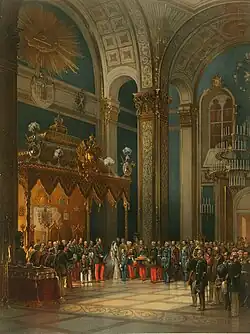 Hommage des cosaques au couronnement d'Alexandre II en 1856, toile de Georg Wilhelm Timm, 1856.