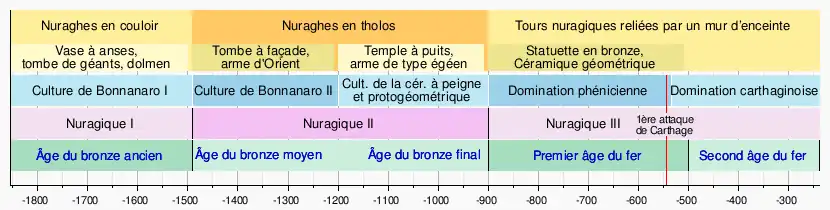 Le terme nuragique (ou nouragique) est issu de l’empreinte la plus marquante de cette société, les imposants nuraghes, que l’on peut trouver dans toute la Sardaigne. Il en reste aujourd’hui 7 000 environ et il est certain qu'ils étaient plus nombreux à l'époque. C’est vers -900, que cette civilisation commence à décliner lentement, avec l’arrivée de colonies phéniciennes, pour voir sa fin vers -238, avec l’arrivée du pouvoir romain.