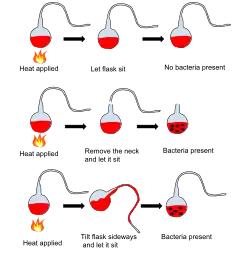 Un autre débat capital du dix-neuvième siècle est celui entourant la génération spontanée. Cette idée d'origine aristotélicienne postulait que de nouvelles formes de vie apparaissaient à partir de matière inerte, lorsque les conditions favorables étaient réunies. Au XIXe siècle, elle a encore ses partisans en ce qui concerne les micro-organismes. Louis Pasteur, avec sa célèbre expérience du col de cygne, qui prouve que des bactéries ne se développent dans un milieu de culture préalablement stérilisé que si des « germes » venant de l'air ambiant ont pu s'y introduire, réfute toute génération spontanée[22].