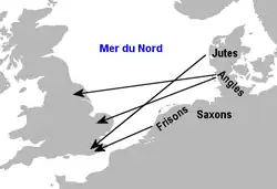 Les dialectes germaniques, qui ont connu la première mutation consonantique, sont alors désignés sous le nom de vieil anglais, d'abord écrit en runes, puis avec l'alphabet latin, apporté par les scribes irlandais au VIIIe siècle. Le vieil anglais est phonétiquement très proche du vieux frison, davantage que ne l'est ce dernier du vieux bas francique ou du vieux saxon[1], bien que les Îles Britanniques aient longtemps été rattachées à la Frise par le Doggerland, il n'est toutefois pas possible de préciser la période de l'implantation de la langue en sol anglais puisque les Frisons ne sont généralement pas mentionnés parmi les peuples envahisseurs des Iles Britanniques. Il en va de même pour le scots d'Écosse et d'Irlande. Certains linguistes parlent d'anglo-frison pour désigner l'idiome originel. On le qualifie également d'« ingvaeonique ».