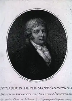 La médecine dentaire est introduite en Europe pour la première fois en France comme discipline médicale indépendante. Louis XIV (1638–1715) promulgue l'édit Expert pour les dents, qui interdit aux barbiers l'extraction des dents et introduit un corps de métier aux mêmes droits que le chirurgien, le chirurgien dentiste. Par la suite, Pierre Fauchard (1679-1761) publie en 1723 le livre Le Chirurgien Dentiste ou Traité des dents[60]. Avec cette publication, Fauchard est considéré comme le père de la médecine dentaire moderne. Son livre est le premier qui décrit en détail l'art dentaire, y compris les bases de l'anatomie et du fonctionnement de la bouche, ainsi que des procédés chirurgicaux, conservatoires et prothétiques. Ses réflexions sont complètement nouvelles. Il rejette comme fausse ce qu'il appelle la théorie allemande du ver de la dent comme cause de carie. Il a souvent regardé au microscope et n'a jamais trouvé de ver. Le sucre nuit aussi bien à la pulpe dentaire qu'aux dents. Il faut limiter la consommation de sucre dans la nourriture quotidienne. Les dents de lait semblent se séparer de leurs racines. (Cette affirmation fausse repose sans doute sur le fait que les dents de lait tombées n'ont plus de racines, car celles-ci se résorbent avant la chute). Le premier rapport de cas de transplantation dentaire homoplastique (d'homme à homme) est fait en 1728 par Pierre Fauchard.