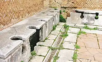 Babylone, est une ville antique de la Mésopotamie située dans l'Irak actuel. On situe le début de sa construction au IIIe millénaire, mais sa profonde transformation et son apogée datent du Ve siècle av. J.-C., avec le roi conquérant Nabuchodonosor II et la construction de palais, temples, ziggourats et des grandes voies de circulation. Babylone, ville plusieurs fois détruite et reconstruite au cours des âges, est l'objet de fouilles depuis une centaine d'années par plusieurs équipes internationales dont des allemandes[48]. La ville était construite sur la partie gauche de l'ancien lit de l'Euphrate, des fossés et canaux remplis par l'eau du fleuve constituaient à la fois un rideau défensif, mais également permettaient le drainage des eaux de pluie et l'évacuation des eaux usées vers le fleuve[49]. Des réseaux d'adduction d'eau de la ville il subsiste peu d'informations, soit par la destruction du site au cours des différentes invasions, anciennes ou plus récentes, soit également par les recherches archéologiques non terminées ou pas encore entreprises.