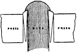 Les cartons, souvent mal logés le long du dos, ont tendance à retomber trop vite sur le livre lorsqu'il est consulté, voire à bloquer son ouverture[57]. Les premières grandes presses de relieur sont inventées au cours du XVIe siècle, copiées sur le système du pressoir, avec une barre permettant le serrage[57]. Elles permettent de pallier, dans un premier temps, ces problèmes d'« endossure » des livres après la couture des cahiers et l'arrondissure des dos. En aplatissant bien les cartons contre les cahiers, les premiers « mors » étaient ainsi formés[57].