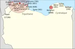En 1949, on compte entre 35 000 et 36 000 Juifs dans l’ensemble du pays, 30 000 en Tripolitaine, dont 22 000 à Tripoli et le reste réparti entre 17 bourgades et villages de la côte et des montagnes de l'arrière-pays[39]. Parmi ces Juifs « ruraux », on compte une communauté de 500 Juifs troglodytes vivant au côté des berbères ibadites du djebel Nefoussa. Le reste des Juifs, environ 5 000, vit en Cyrénaïque, très majoritairement à Benghazi, la capitale régionale[39].