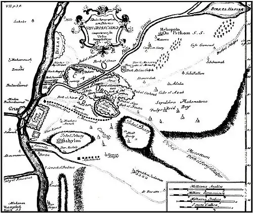 Pendant le siège de la forteresse de Babylone, 'Amr établit les tribus, qui constituent les troupes de la conquête arabe, dans un camp quasi permanent au nord de celle-ci. Après avoir fait le siège d'Alexandrie en 642 et obtenu la reddition de cette grande ville byzantine.