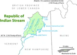 Le , une poignée de fermiers se déclarent fatigués des disputes constitutionnelles entre la Grande-Bretagne, propriétaire du Canada, et les États-Unis. Ils créent à la frontière, à l'extrême nord du New Hampshire, entre le torrent Halls au nord-ouest (la frontière selon les Américains) et la rivière Connecticut au sud-est (la frontière selon les Britanniques), un minuscule État indépendant: la République de l'Indian Stream[8], dotée d'une constitution en 13 articles.
