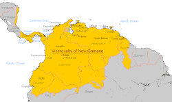 Le pays est de facto dirigé par le vice-président Francisco de Paula Santander (1792-18490). En effet, Simón Bolívar (1783-1830) continue la lutte contre l'Espagne au Pérou et en Bolivie[18] au côté de l'autre héros de l'indépendance de l'Amérique du Sud espagnole, l'Argentin José de San Martín (1778-1850) qui a proclamé l'indépendance du Pérou le [19]. L'armée royaliste résiste jusqu'à sa défaite lors de la bataille d'Ayacucho, la [20], après quoi Bolívar préside le nouvel État péruvien[18].