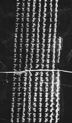 Mais d'abord, ils débitent le film Eastman sur sa longueur en trois rubans de 19 mm de large. Edison, qui dans sa jeunesse a été un habile opérateur du télégraphe électrique, est familiarisé à la présence de perforations sur le ruban de papier de l’invention de Samuel Morse, qui assurent l'avancée du message[62]. Il dote la bande de 19 mm (³⁄₄ de pouce) d'une unique rangée de perforations rectangulaires arrondies dont il prend soin de déposer le brevet. Ces perforations se situent sous le photogramme, à raison de 6 perforations par image, car le défilement de la pellicule se fait à l'horizontal. Les photogrammes obtenus sont circulaires, dernier lien de l’invention avec les jouets optiques et mesurent en diamètre 1/2 pouce, soit environ 13 mm.