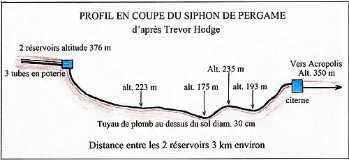 Concernant les tuyauteries retrouvées dans le caravansérail au sud du palais de Cnossos, il est suggéré par Andreas N. Angelakis, reprenant les textes de Sir Arthur John Evans que : « L'alimentation de ce bâtiment se faisait depuis une source sur la colline de Gypsades et que l'eau devait d'abord descendre de cette colline, puis remonter pour l'alimentation du caravansérail, suivant le principe des vases communicants. Les artisans – plombiers – minoens avaient la connaissance des vases communicants et du principe du siphon[64]. » Ce système hydraulique sera utilisé par les plombiers romains un millénaire plus tard, pour l'alimentation de la ville de Pergame, actuellement en Turquie, au IIe siècle av. J.-C. et pour l'alimentation de la ville de Lugdunum (Lyon) au IIe siècle av. J.-C., avec notamment les siphons de l'aqueduc du Gier.