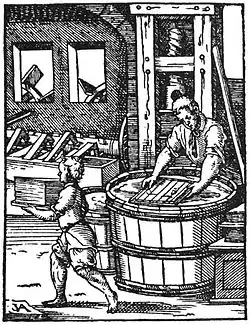 Une fabrication locale va vite remplacer l'importation. Les marchands italiens, pour répondre à la croissance de la demande, font venir des artisans pour former du personnel local. Dès le XIVe siècle, des moulins à papier sont installés dans la région de Troyes, autour de Paris et dans le Comtat Venaissin. Le premier est installé vers 1348 à Torvoy-lez-Troyes (Champagne), une autre vers 1350 à Ambert (Auvergne)[18]. Au milieu du XVe siècle, la production française suffit pour satisfaire sa consommation et les moulins en Champagne commencent à exporter leur fabrication.