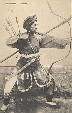 L'utilisation Chinoise de l'archerie remonte à la dynastie Shang. Les catégories d'officiers dans l'armée Shang incluaient les ya et shi (commandants), ma (officier de char), et she (officier archer). Les Chinois utilisaient les chars de guerre avec des archers. La dynastie Zhou qui succéda à la dynastie Shang vit des tournois d'archerie organisés en présence de la noblesse. L'arc était l'arme noble, au même titre que l'épée en Europe. Tous les cinq ans le gouverneur était sélectionné à l'issue d'un concours entre autres de tir à l'arc en musique. Cette épreuve consistait en une série de tirs à effectuer quand l'archer entendait le son d'un gong dans l'orchestre. Les coups au but ne comptaient que si la flèche atteignait la cible au moment précis où l'on entendait le gong. Celui qui visait juste et au rythme du gong était apte à gouverner. Le sinogramme 中 (zhong) symbolise d'ailleurs une flèche traversant le milieu d'une cible[11]. À la fin de la période Zhou, des ouvrages sur l'archerie ont été consignés sur du bois ou du bambou.