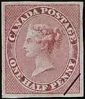 C'est donc en 1851[7] que sont émis les 3 premiers timbres-poste canadiens (contenant la mention « CANADA POSTAGE ») de valeurs respectives de 3d, 6d et 12d (d = pence). Ces timbres sont imprimés sur du papier vergé en feuilles non dentelées et les caractères sont gravés.