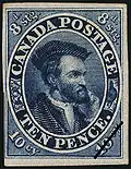 En janvier 1855, la province émet donc le timbre bleu de 10 pence (en monnaie) sur papier mince à l'effigie de Jacques Cartier. Le portrait fut gravé d'après une peinture exécutée par François Riss vers 1839. Dans les coins inférieurs, sont indiqués « 10 cy » et dans les coins supérieurs, « 8 d. stg. ». Des impressions subséquentes sont faites sur papier épais et certaines en bleu mat.