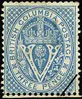 La Colombie-Britannique a émis des timbres de couleurs différentes illustrés du sceau de cette colonie sur papier dentelé 14. Elle a émis un premier timbre de 3 pence bleu avec le filigrane « Crown and C.C. ». De 1867 à 1871, cette colonie a émis des timbres décimaux de couleurs différentes de dénominations de 2, 5, 10, 25 et 50 cents et un dollar. Les montants décimaux étaient en surimpression sur l'illustration du 3 pence selon le modèle TWO CENTS puis de 5.CENTS.5 à 1.DOLLAR.1. Ceux de 10 ¢ et de 1 $ n'ont jamais été mise en usage. Certains timbres neufs de 50 ¢ ont été imprimés avec le filigrane inversé. En , la C-B a émis et mis en usage ces timbres de 5 ¢ à 1 $ sur papier perforé 12½.