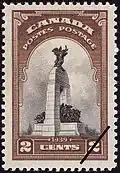 Le ministère des postes a dû surcharger 15 millions de timbres de 3 ¢ déjà en stock pour les mettre au tarif rétablit à 2 ¢ le . Comme le travail n'a pas été satisfaisant à cause de la difficulté de surcharger des feuilles déjà encollées, les postes n'ont conservé que 500 feuilles qu'elles ont émises le pour la philatélie.