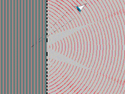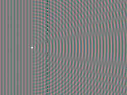 Dans la figure de droite on éclaire la scène avec des ondes planes venant de gauche. Une partie de cette lumière est réfléchie par le point représenté par un rond blanc. Seules les ondes réfléchies vers la droite ont été dessinées. Ces ondes sphériques s'éloignent du point et s'additionnent avec les ondes planes qui illuminent la scène. Là où les sommets coïncident avec des sommets et les creux avec des creux, il y aura un maximum d'amplitude. Symétriquement, quand des sommets coïncident avec des creux, l'amplitude sera moindre. Il faut remarquer qu'il y a des points de l'espace qui correspondent toujours à un maximum d'amplitude et d'autres qui correspondent toujours à un minimum d'amplitude.