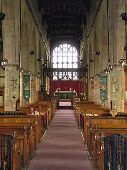 Les fonts baptismaux, somptueusement sculptés et arborant les armes de la maison de Bromfield, datent du début des années 1490. Il y a dans l'aile au sud du chancel une piscine sculptée rapportée d'une autre église. Une plaque commémorative dans l'aile du chancel nord est datée de 1666[4]. L'orgue à double-clavier est un instrument Norman & Beard de 1910 rapporté et réassemblé en 1976 d'une église du Nord de l'Angleterre[5]. Le carillon à six cloches a été coulé au XVIIIe siècle par les Rudhall de Gloucester[6]. L'église porte les stigmates de combats de la Première Révolution anglaise : la façade ouest est percluse de balles de mousquet, tandis que le parement nord est défiguré par trois impacts[7],[8]. Une tablette de bronze comporte un acrostiche où l'on retrouve le nom de : « Thomas Crue[8]. »