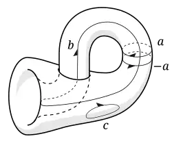 est la bouteille de Klein, qui est un tore avec une torsion (La torsion peut être vue dans le diagramme carré comme l’inversion de la flèche du bas). C'est un théorème que la surface recollée doit s'auto-intersecter (lorsqu'elle est dans un espace à 3 dimensions). Comme pour les tores, les cycles a et b ne peuvent pas être réduits tandis que c peut l'être. Mais contrairement au tore, suivre b en avant, à droite et en arrière retourne la gauche et la droite, car b coupe la torsion donnée à une jointure. Si une coupe équidistante d'un côté de b est réalisée, elle revient de l'autre côté et contourne une seconde fois la surface avant de revenir à son point de départ en découpant une bande de Möbius torsadée. Comme les zones de gauche et de droite locales peuvent être réorientées de manière arbitraire de cette manière, la surface dans son ensemble est dite non orientable.