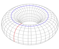 Le tore est défini comme un produit cartésien de deux cercles . Le tore a une composante liée à un chemin unique, deux trous unidimensionnels indépendants (indiqués par des cercles en rouge et bleu) et un trou bidimensionnel comme intérieur du tore. Les groupes d'homologie correspondants sont[17]