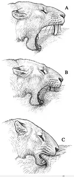 Dessins d'une tête d'Homotherium par M. Antón restituant le processus de « morsure par cisaillement ».