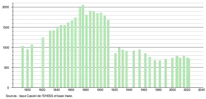 L'évolution du nombre d'habitants est connue à travers les recensements de la population effectués dans la commune depuis 1793. Pour les communes de moins de 10 000 habitants, une enquête de recensement portant sur toute la population est réalisée tous les cinq ans, les populations de référence des années intermédiaires étant quant à elles estimées par interpolation ou extrapolation[34]. Pour la commune, le premier recensement exhaustif entrant dans le cadre du nouveau dispositif a été réalisé en 2005[35].