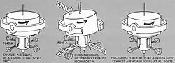 - Quand il est entraîné par dépression, à l'aide d'une pompe à vide (succion pump), le flux d'air entraine les ailettes de la roue gyroscopique pour assurer sa rotation. Dans ce cas, ces modèles sont plus longs que les modèles électriques pour atteindre une vitesse de rotation optimale. Un drapeau rouge indique une vitesse de rotation insuffisante. Un bouton sous la maquette de l'avion permet, comme pour les modèles électriques, d'aligner la maquette de l'avion sur l'horizon. Le fonctionnement de l'appareil peut être vérifié en consultant l'indicateur du système de dépression, ou en s'assurant lors de virages, pendant le roulage de l'appareil, que l'horizon reste stable.