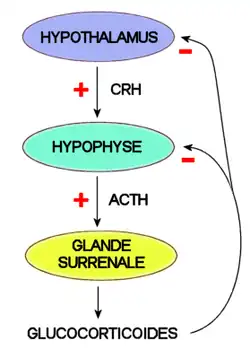 Inversement, il existe un rétrocontrôle négatif par les glucocorticoïdes, qui agissent principalement sur l'hypophyse en inhibant l'expression du gène de la POMC et en bloquant la libération d'ACTH dans la circulation sanguine. Les glucocorticoïdes inhibent également en amont, la synthèse des trois hormones sécrétagogues au niveau de l'hypothalamus et bloquent la sécrétion de la CRH stockée.