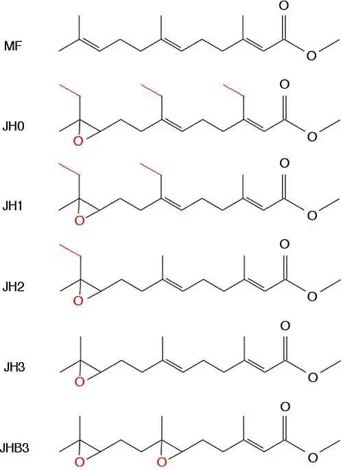 - JHB3 : hormone juvénile à 16 carbones et 2 époxydes : C16H26O4