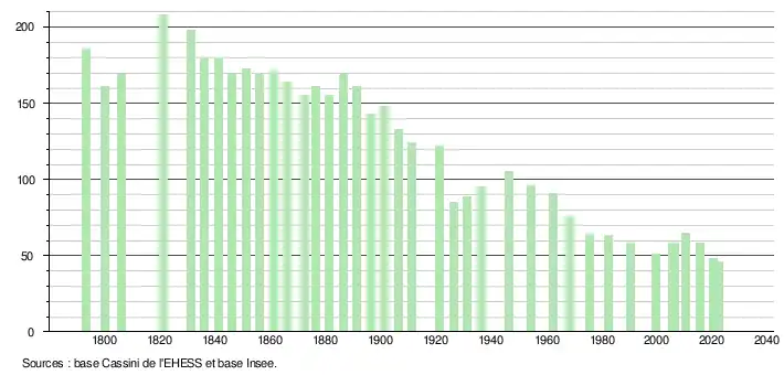L'évolution du nombre d'habitants est connue à travers les recensements de la population effectués dans la commune depuis 1793. Pour les communes de moins de 10 000 habitants, une enquête de recensement portant sur toute la population est réalisée tous les cinq ans, les populations de référence des années intermédiaires étant quant à elles estimées par interpolation ou extrapolation[16]. Pour la commune, le premier recensement exhaustif entrant dans le cadre du nouveau dispositif a été réalisé en 2005[17].
