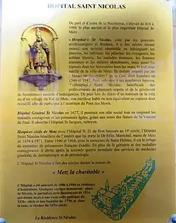 - ↑ Docteur Henri Allimant, Quelques notes historiques sur l’hospice Saint-Nicolas, exposé en vue de la création d’un service de pédiatrie à l’hôpital Bon-Secours, extrait de la communication faite le 15 avril 1864 à la commission administrative de l’hospice Saint-Nicolas par Félix Maréchal, maire de Metz.