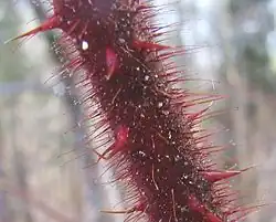 Les feuilles et les tiges des plantes peuvent être couvertes de piquants pointus, d'épines ou de trichomes (poils sur les feuilles souvent avec des barbes), contenant parfois des substances irritantes ou des poisons. Certaines structures végétales caractéristiques, comme les épines peuvent réduire l'alimentation des grands herbivores ongulés (comme le koudou, l'impala et les chèvres) en limitant le taux d'alimentation des herbivores, ou en usant leurs molaires[61]. Les raphides sont des aiguilles d'oxalate de calcium ou de carbonate de calcium présentes dans les tissus végétaux, qui rendent douloureuse leur ingestion, pouvant blesser la bouche et l'œsophage des herbivores et facilitant la libération des toxines de la plante. La structure de la plante, sa ramification et la disposition des feuilles, peuvent également évoluer pour réduire l'impact des herbivores. Les arbustes de Nouvelle-Zélande ont évolué vers des ramifications étalées, adaptation qui pourrait être une réponse aux oiseaux grignoteurs, tels que les moas (espèces éteintes)[62]. De même, les acacias africains ont de longues épines dans le bas de la canopée, mais des épines très courtes dans le haut de la canopée, laquelle est relativement à l'abri des herbivores comme les girafes[63],[64].