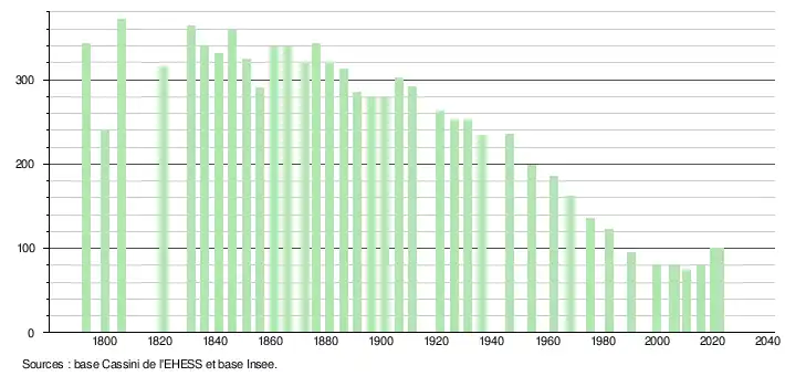 - ↑ Fiches Insee - Populations de référence de la commune pour les années 2006, 2007, 2008, 2009, 2010, 2011, 2012, 2013, 2014, 2015, 2016, 2017, 2018, 2019, 2020, 2021 et 2022.