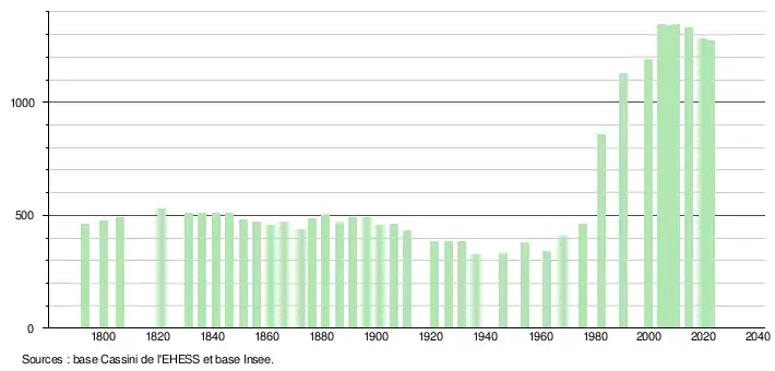 L'évolution du nombre d'habitants est connue à travers les recensements de la population effectués dans la commune depuis 1793. Pour les communes de moins de 10 000 habitants, une enquête de recensement portant sur toute la population est réalisée tous les cinq ans, les populations de référence des années intermédiaires étant quant à elles estimées par interpolation ou extrapolation[31]. Pour la commune, le premier recensement exhaustif entrant dans le cadre du nouveau dispositif a été réalisé en 2004[32].