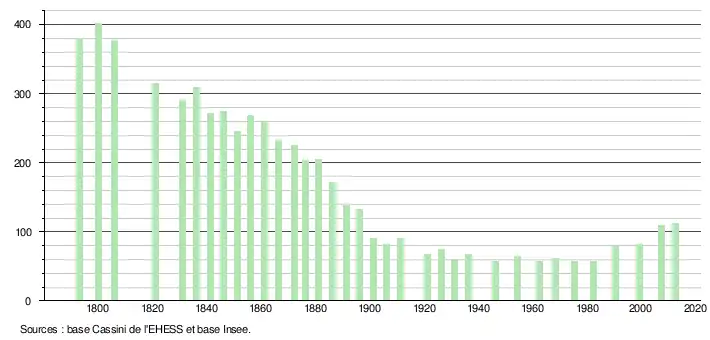 - ↑ Par convention dans Wikipédia, le principe a été retenu de n’afficher dans le tableau des recensements et le graphique, pour les populations légales postérieures à 1999, que les populations correspondant à une enquête exhaustive de recensement pour les communes de moins de 10 000 habitants, et que les populations des années 2006, 2011, 2016, etc. pour les communes de plus de 10 000 habitants, ainsi que la dernière population légale publiée par l’Insee pour l'ensemble des communes.