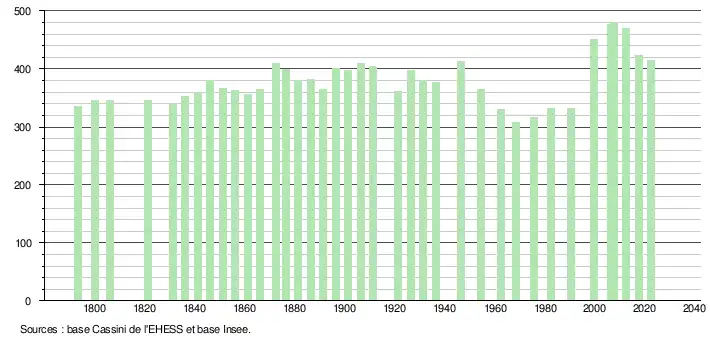 L'évolution du nombre d'habitants est connue à travers les recensements de la population effectués dans la commune depuis 1793. Pour les communes de moins de 10 000 habitants, une enquête de recensement portant sur toute la population est réalisée tous les cinq ans, les populations de référence des années intermédiaires étant quant à elles estimées par interpolation ou extrapolation[22]. Pour la commune, le premier recensement exhaustif entrant dans le cadre du nouveau dispositif a été réalisé en 2007[23].