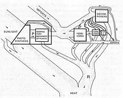 De ce point de vue, les cycles biogéochimiques sont régis par l'énergie rayonnée[21]. Odum exprimait l'équilibre entre l'énergie apportée et restituée comme le rapport entre la production (P) et la respiration (R): P/R. Il classait les organismes aquatiques en fonction de leur taux P/R, et montra qu'il permettait nettement de distinguer les écosystèmes autotrophes des hétérotrophiques. Il semble qu'Odum ait emprunté cette idée aux travaux de son directeur de thèse, G. E. Hutchinson, pour qui une communauté biotique peut être assimilée à un organisme dans la mesure où on peut lui assigner un métabolisme propre[22] ; toutefois, Golley remarque qu'Odum a cherché à caractériser les communautés biotiques par d'autres critères que ce rapport, au risque de contredire les principes de l'énergétique des systèmes.