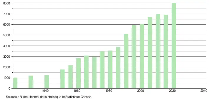 - ↑ Bureau fédéral de la statistique, recensements du Canada pour les années 1921, 1931, 1941, 1951, 1956, 1961 et 1966.