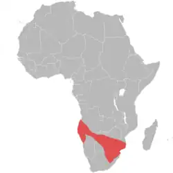 Botswana, Namibie, Afrique du Sud (désert du Kalahari, désert de Namibie), Mozambique, Zimbabwe ouest et sud[3],[4] Mozambique sud[5].
