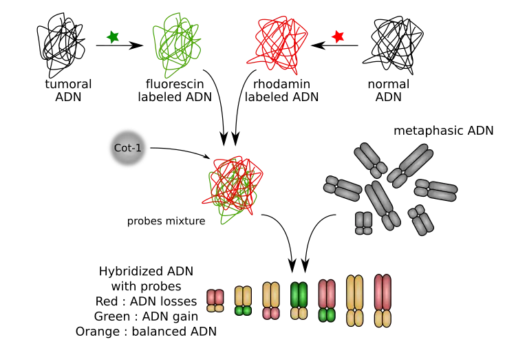 L'ADN d'un patient est extrait de tissu normal (souvent des lymphocytes) et de tissu potentiellement tumoral puis marqué par des fluorochromes. En général, l'ADN tumoral est marqué en vert par la fluorescéine (sous forme de dUTP-FITC) et l'ADN de tissu sain en rouge par la rhodamine (sous forme de dUTP-TR).