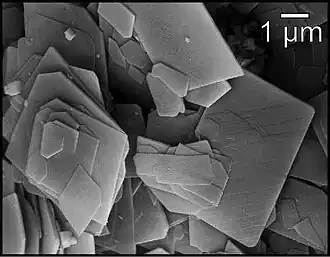 | Habitus | rares petits cristaux aciculaires ou en feuillet ou en lamelles aplaties; agrégat cristallins, fibreux, à aspect crayeux fissuré ou compact, rosette de cristaux lamellaires à terminaison aiguë ; petites touffes radiées, masses compactes ou crayeuse (friables); recouvrement massif, crayeux, incrustations fibreuses radiées, granulaires ou terreuses... |