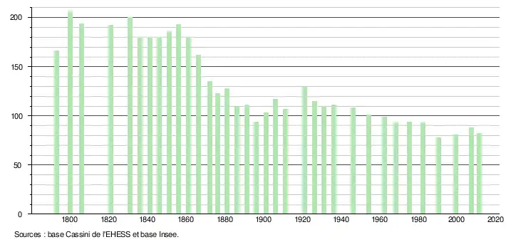 - ↑ Par convention dans Wikipédia, le principe a été retenu de n’afficher dans le tableau des recensements et le graphique, pour les populations légales postérieures à 1999, que les populations correspondant à une enquête exhaustive de recensement pour les communes de moins de 10 000 habitants, et que les populations des années 2006, 2011, 2016, etc. pour les communes de plus de 10 000 habitants, ainsi que la dernière population légale publiée par l’Insee pour l'ensemble des communes.