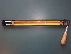 Il est constitué de deux thermomètres mesurant au même moment et au même endroit la température de l'air (dite température du thermomètre sec[31]) et sa « température humide ». Pour mesurer la « température humide » (ou température du thermomètre mouillé), il faut techniquement que le deuxième thermomètre soit entouré d'une mèche imbibée d'eau liquide et que l'air humide en contact avec ce thermomètre s'écoule autour de celui-ci avec une vitesse suffisante[32]. Ainsi, en régime permanent, le séchage de la mèche humide provoque une baisse de température isenthalpique jusqu'à saturation de l'air en contact immédiat avec le thermomètre.
